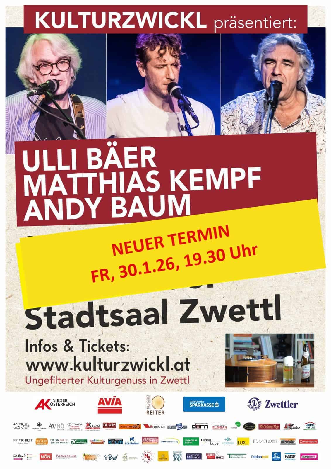 wir freuen uns sehr, Euch den neuen Termin für unser Konzert mit ULLI BÄER, MATTHIAS KEMPF & ANDY BAUM bekanntgeben zu dürfen: